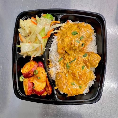 Succulent coconut chicken thighs, carefully marinated in a fragrant mixture of gourmet herbs, slowly cooked to perfection in a rich and creamy sauce made with vegetable paste and coconut milk, served with a side of fluffy rice,, steamed vegetables, and sweet plantains. No dairy, no tree nuts, gluten-free.